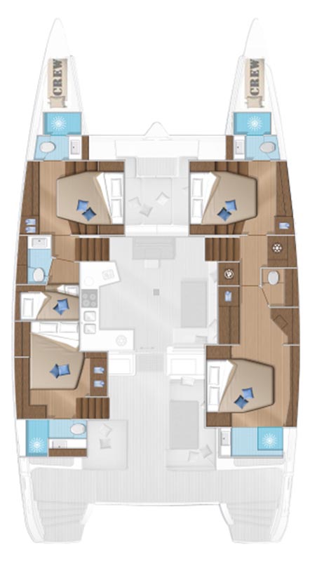 ‘QUEEN OF DIAMONDS’ is one of the biggest catamarans in 52 feet. She is a Lagoon 52, with the superior extra of a flybridge, that creates a great area to relax, along with your captain while sailing. The L52 practically created 3 different spaces for the guests to relax, these would be the cockpit, the forward saloon and the flybridge. Equipped for a skippered charter with all the amenities of a floating hotel, including air conditioning, generator, solar panels, comfortable cockpit cushions, sunbeds, electric heads, usb sockets in all cabins and saloon, 3 refridgerators and many additional amenities you can see listed below, surely she will offer you a great vacation experience.